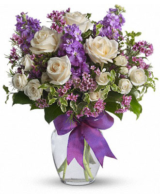 This medium-sized bouquet is lightweight and won't take up much space, yet it packs a punch with its heavenly colors and an assortment of your favorite flowers. From the gentle white roses to the indigo lavender stocks, these flowers look as though they've been plucked from a magical garden.