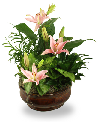 This sophisticated and refined planter is an excellent way to convey your condolences. It includes stunning coral Asiatic lilies arranged in a dish with rich greenery, and it is a gift that expresses your deepest sympathies and offers a message of hope and respect. The muted hues are not too vibrant, serving as a gentle reminder of your support during this trying time.